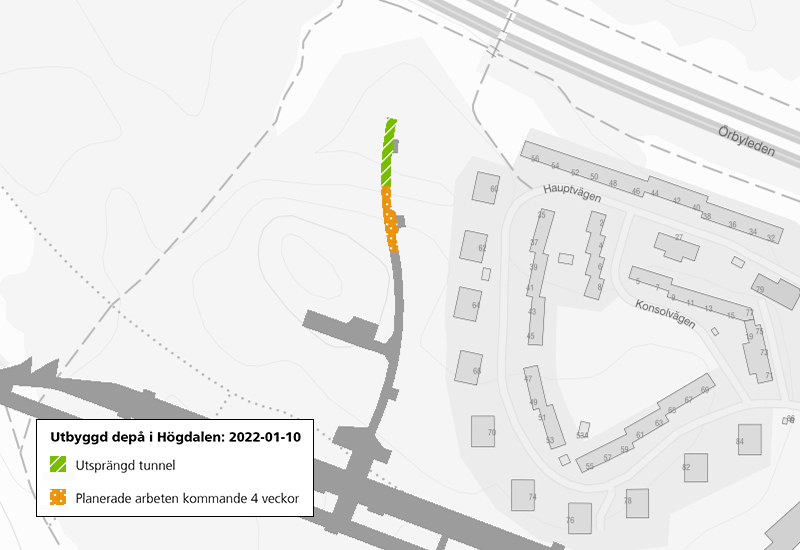 Tunneln vid Örbyleden i Hökarängen började sprängas ut under förra året. Nu kan du följa arbetet och tunnelfrontens position på den framdriftskarta som uppdateras var fjärde vecka. Du hittar kartan nedan eller på projektets startsida.