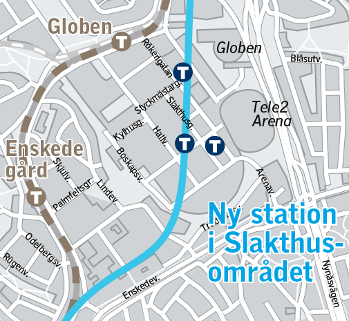 När den befintliga gröna Hagsätralinjen blir Blå blir följden att stationerna Globen och Enskede gård stängs. Den nya stationen i Slakthusområdet ska ersätta dem. Placering och utformning i detalj av stationsentréerna inom Slakthuset utreds vidare i dialog med Stockholms stad. I södra delen byggs en stationsentré mot den planerade Evenemangstorget invid Tele2 Arena.