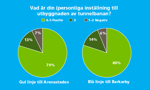 Det är många som ser fram emot tunnelbanan, åtta av tio är positiva eller mycket positiva och bara sex till sju procent är negativa. I de öppna svaren är det många som beskriver att de ser fram emot att kunna resa enklare och snabbare, att de gillar satsningar på kollektivtrafik och att det är bra att bilåkandet kan minska.