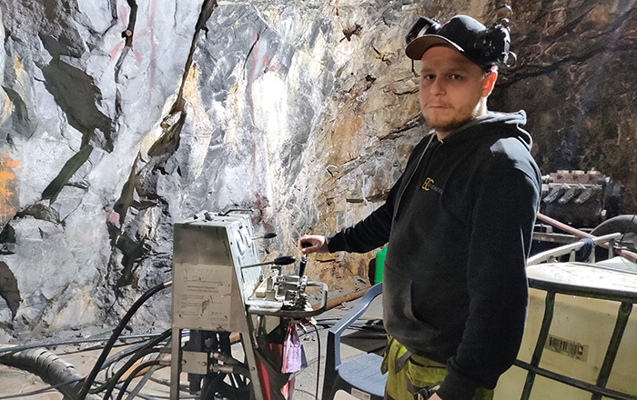 Rickard Söderlund och Alexander Hellström befinner sig under jord. De jobbar med att borra ut 270 meter långa prover från berggrunden. Metoden kallas för styrborrning och är ett precisionsjobb som tar sin tid. Alexander Hellström har jobbat under jord i nära fyra månader nu.