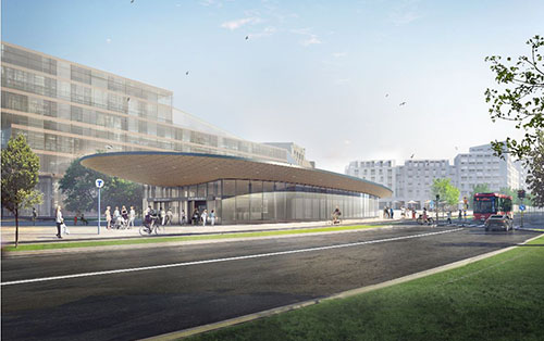 This station on the Blue line will have two entrance ways into the emerging city centre. The eastern entrance way will be situated on the ground floor in a new building, while the western entrance way will be constructed as a pavilion in the middle of the central square.