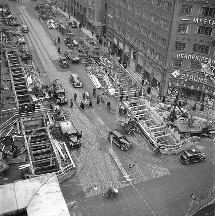 I korsningen Sveavägen – Kungsgatan syns det tydligt hur man grävde fram tunnlarna ovanifrån. Foto: John Kjellström, december 1947, Stockholms stadsmuseum.