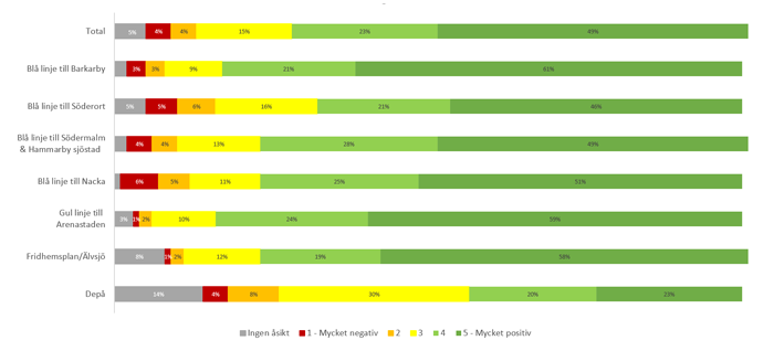 Det är lite skillnad mellan de olika projekten. Till exempel är det bara 6% i Barkarby som är negativa, betyg 1 eller 2, trots att bygget är i full gång. Depåprojektet ligger lägre, med 12 % ettor och tvåor, trots att man inte har börjat med några större arbeten där.