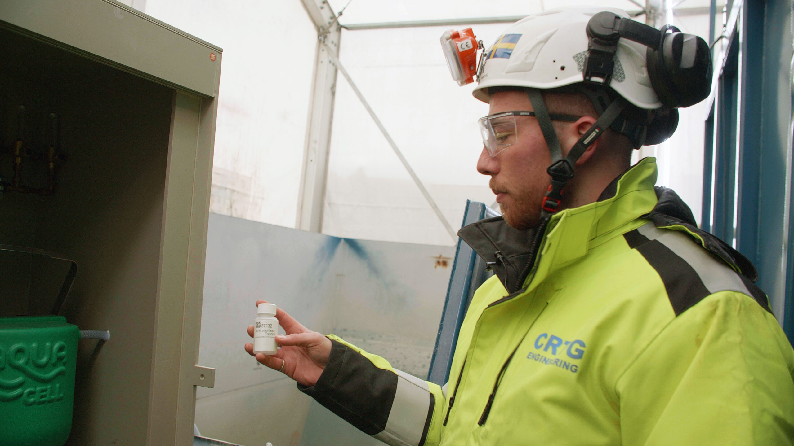 Inne i tältet är en mängd containrar uppställda på olika nivåer. Här slussas vattnet mellan ett flertal olika stationer för noggrann rengöring och provtagning.