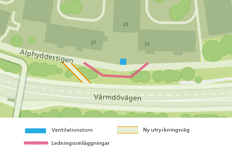 - En utryckningsväg ska byggas mellan Värmdövägen och Alphyddan så att räddningstjänsten kan nå området även när arbetet med ventilationsbyggnaden pågår.