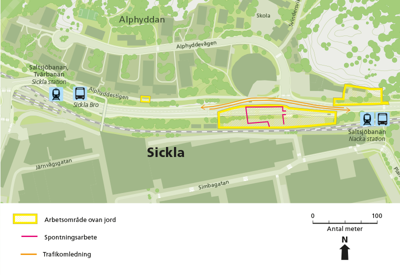 Arbetet ovan jord i Sickla görs på måndag–fredag klockan 07–19.