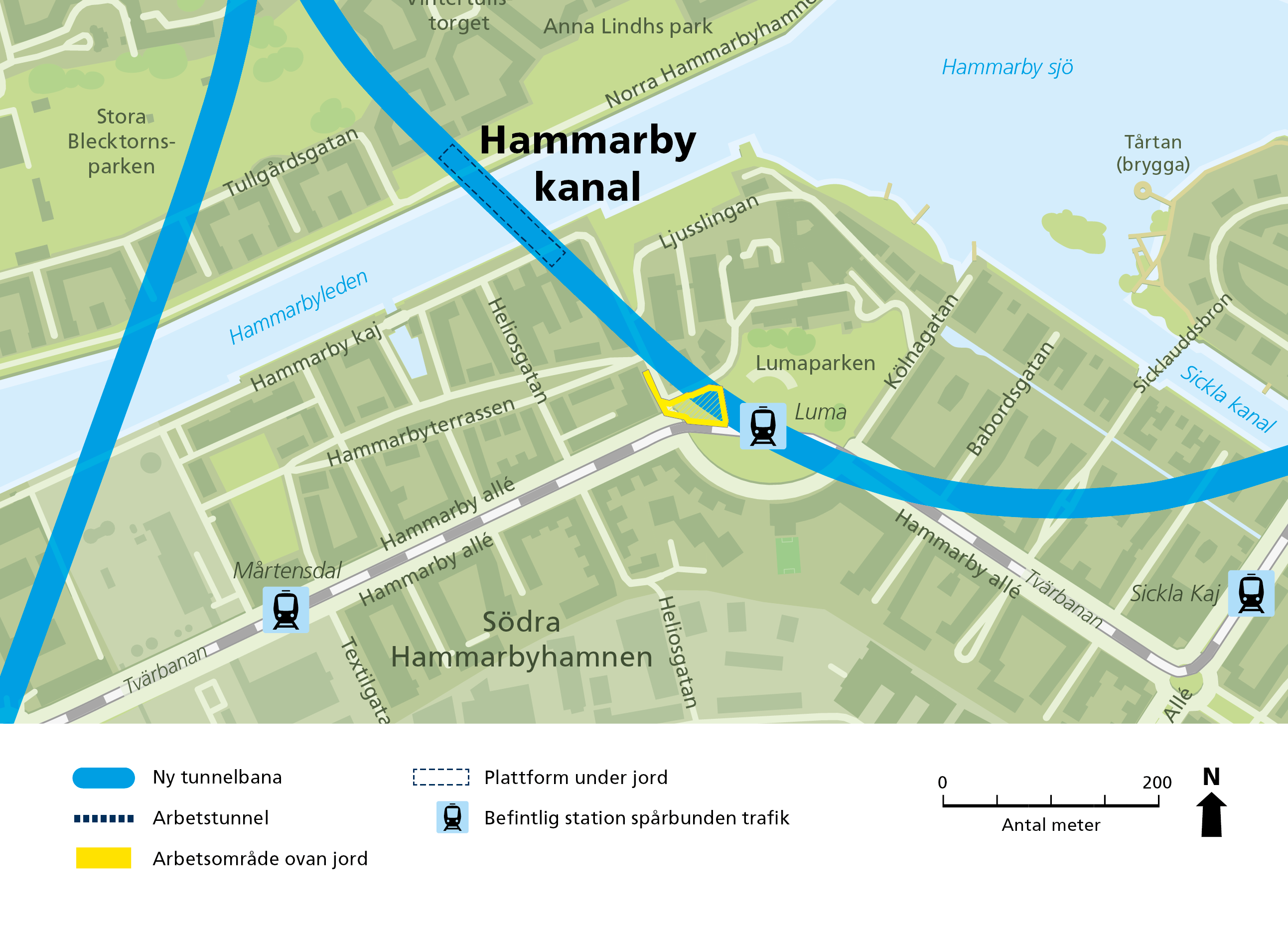Stationen får två uppgångar, en i Norra Hammarbyhamnen och en i Luma. När tunnelbanan tas i drift år 2030 kommer resan mellan Hammarby kanal och T-Centralen att ta 6 minuter.
