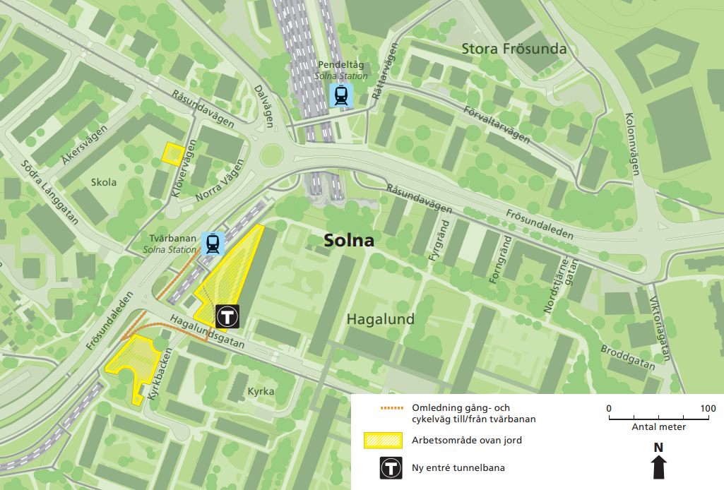 När nya tunnelbanan gräver och flyttar ledningar i marken behöver vi stänga av gångvägen till Tvärbanans Solna station. Gångvägen planeras öppna igen under mars månad. Under tiden behöver du som reser med Tvärbanan ta en annan väg för att komma ned till plattformen från Hagalundsgatan. Du kommer heller inte kunna använda hissen och trapporna som leder från Tvärbanans plattform upp till Hagalundsgatan.