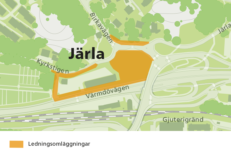 I början på september startar arbetet med station Järla ovan jord. Vi flyttar ledningar för att göra plats för den kommande stationen med biljetthall och rulltrappsschakt. Arbetet med ledningsomläggningar görs på Kyrkstigen, Värmdövägen, Birkavägen och inne på tunnelbanans arbetsområde. Det markerade området kommer delvis att vara otillgängligt under perioden då arbete pågår.