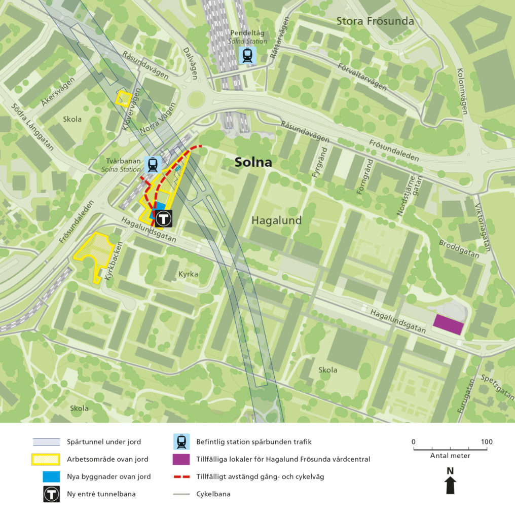 Under mars månad kommer vi att sätta upp stängsel runt arbetsområdet närmast Tvärbanan vid Hagalundsgatan. Till att börja med gör vi olika typer av markarbeten. Vi flyttar ledningar och bygger stödkonstruktioner så att biljetthall, ventilationsschakt och rulltrappor kan byggas. I början av nästa år börjar vi borra och spränga i berget. Redan nu spränger vi ut spårtunnlar från Södra Hagalund och en arbetstunnel vid Dalvägen. Se framdriftskartan för att se hur långt vi har kommit.