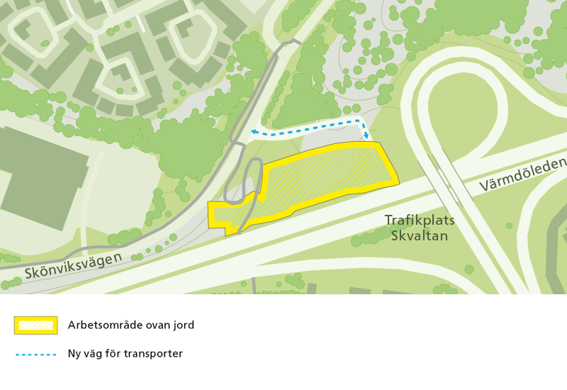 I september öppnar en ny tillfartsväg till tunnelbanans arbetsområde mellan Skönviksvägen och trafikplats Skvaltan. Våra transporter till arbetsområdet kommer framöver att gå via Skönviksvägen (se karta).