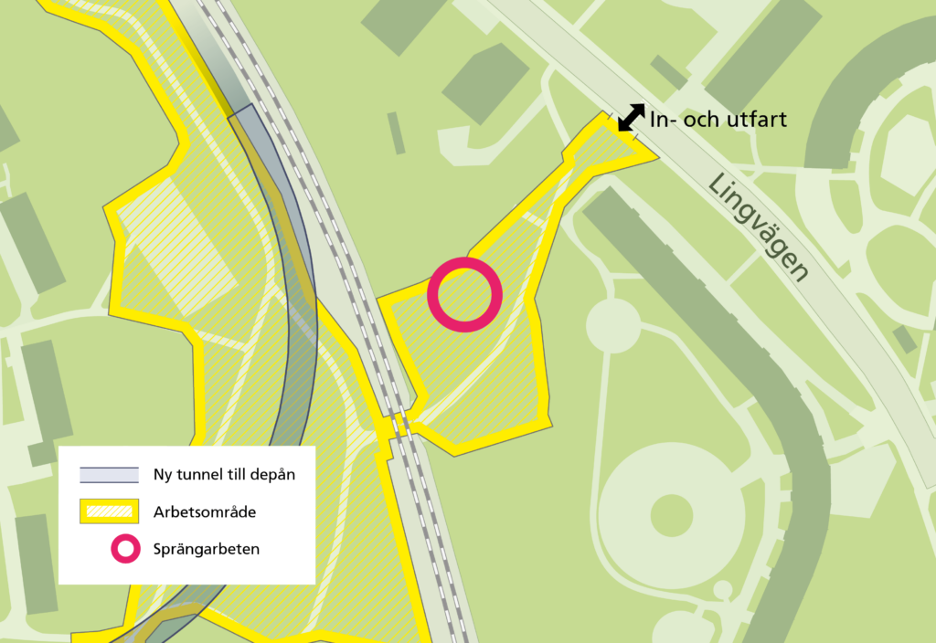 Måndag den 3 februari startar nya sprängarbeten ovan jord på nya tunnelbanans arbetsområde mellan Lingvägen och tunnelbanespåret. Sprängningar kan komma att ske dagligen vardagar under första halvan av februari, för att sedan glesas ut under senare delen av månaden. Ytterligare sprängarbeten kan komma att genomföras under våren.