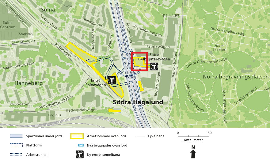 På Åldermansvägen gör vi ovanjordsarbeten för de ventilationsschakt som ska byggas i anslutning till den kommande stationen Södra Hagalund.