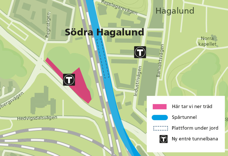 Från och med 13 februari kommer vi börja fälla träd där arbetsområdet för den nya tunnelbanestationen Södra Hagalund ska ligga. Träden tas ned nu för att inte fågellivet under häckningsperioden ska störas. Arbetena med den nya stationen kommer att pågå till och med 2026.