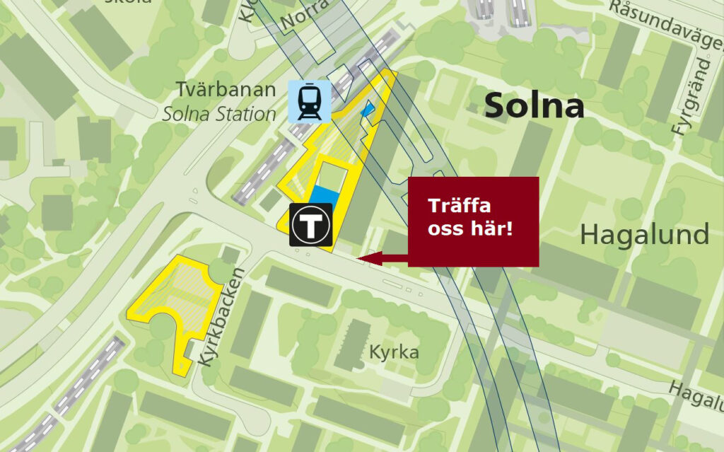 Den 5 och 7 mars mellan klockan 16 och 18 kan du träffa oss som jobbar på nya tunnelbanan på parkeringen utanför nya tunnelbanans arbetsområde på Hagalundsgatan 1. Vi bjuder på fika och svarar på frågor om tunnelbanebygget och hur du kan påverkas. Välkommen!