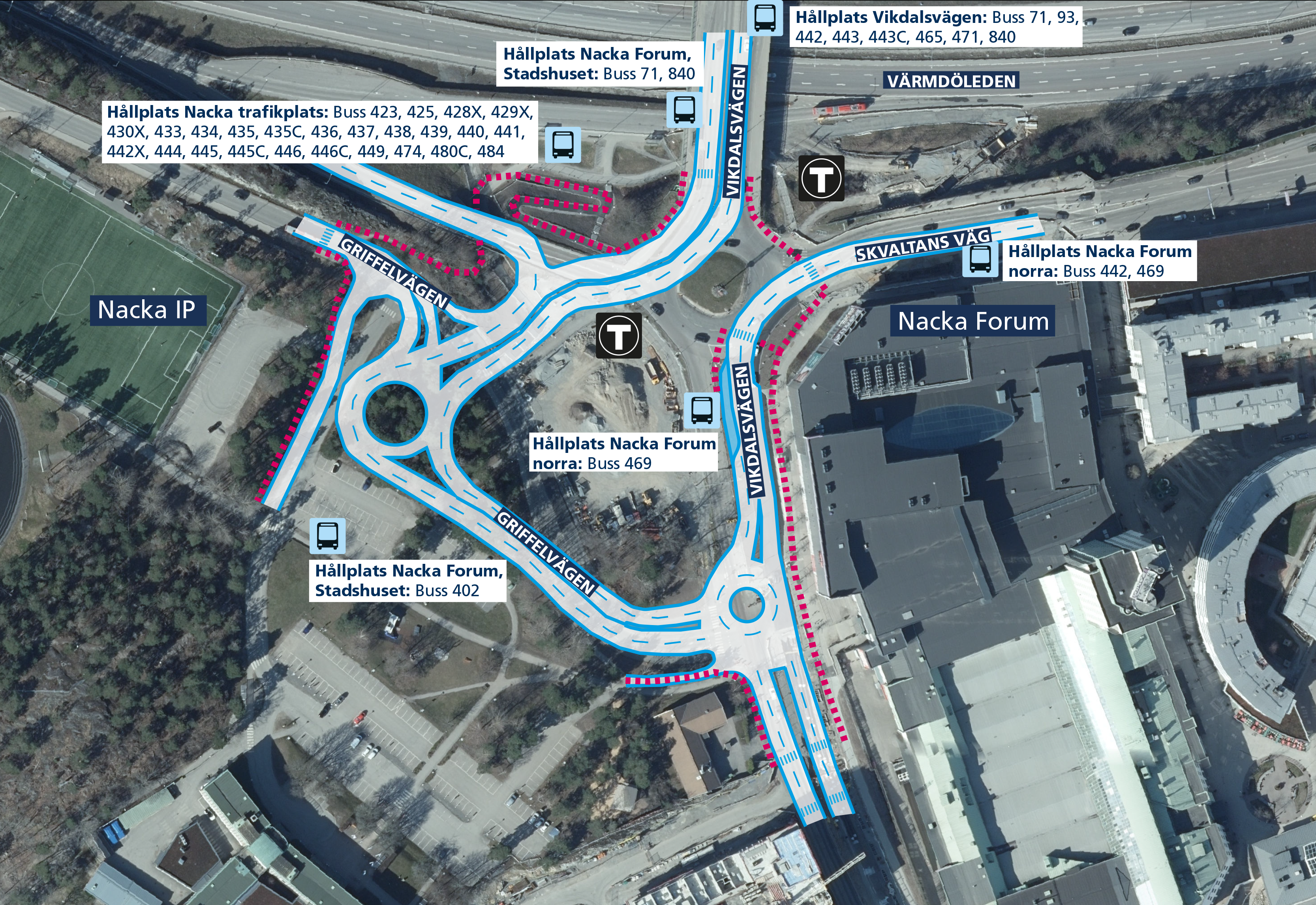 Onsdag morgon 14 december leds trafiken om vid tunnelbanans arbetsområde vid Vikdalsvägen och Griffelvägen utanför Nacka Forum.