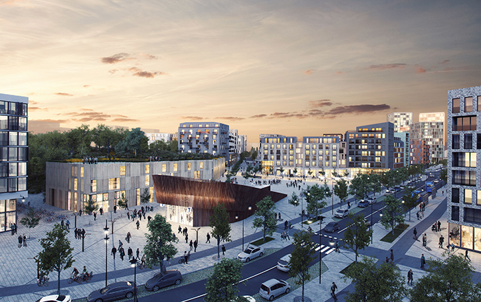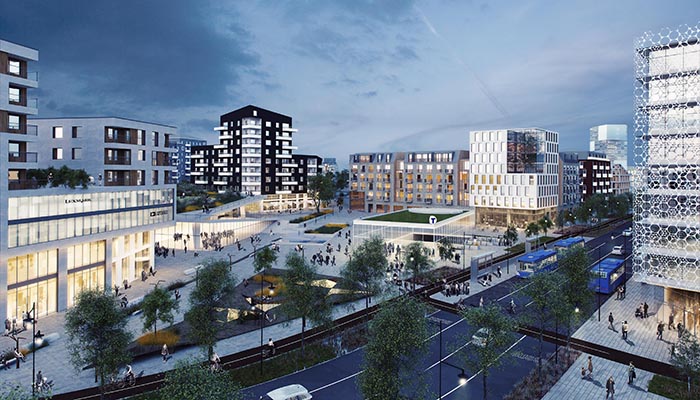 På andra sidan E18, vid Barkarby pendeltågsstation, omvandlas gamla Veddesta centrum och industriområde till stadsmiljö.