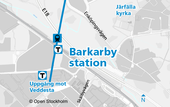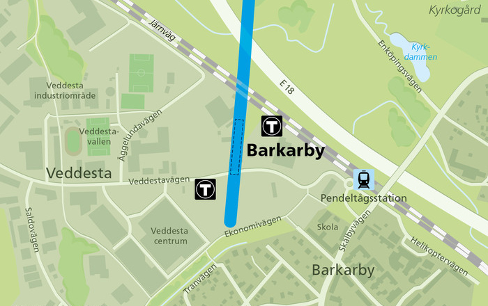Tunnelbanestation Barkarby byggs under jord intill Veddestabron. Stationen får en uppgång med biljetthall vid Barkarby pendeltågsstation, och en vid Veddestavägen i gamla Veddesta centrum.