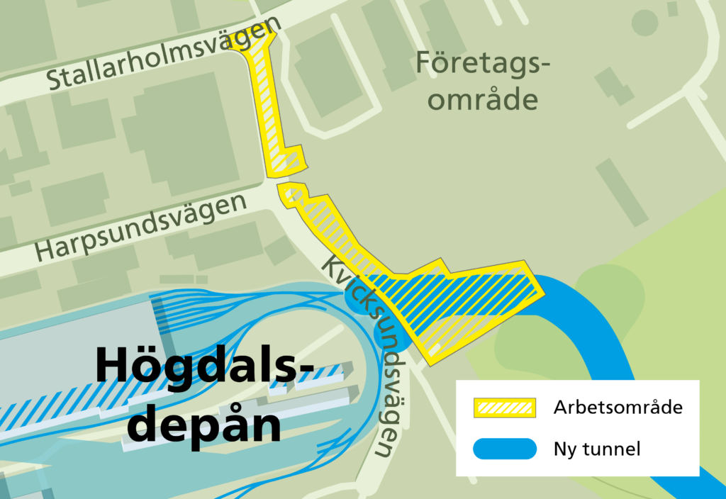 Vid Kvicksundsvägen i Högdalens industriområde pågår arbetet med utbyggnaden av Högdalsdepån. Under vägen ska den nya tunneln gå som kopplar ihop depån med Grön linjes Farstagren. Den första sprängningen vid Kvicksundsvägen är planerad att genomföras under vecka 14 och sprängarbetet kommer att pågå under vår och sommar.