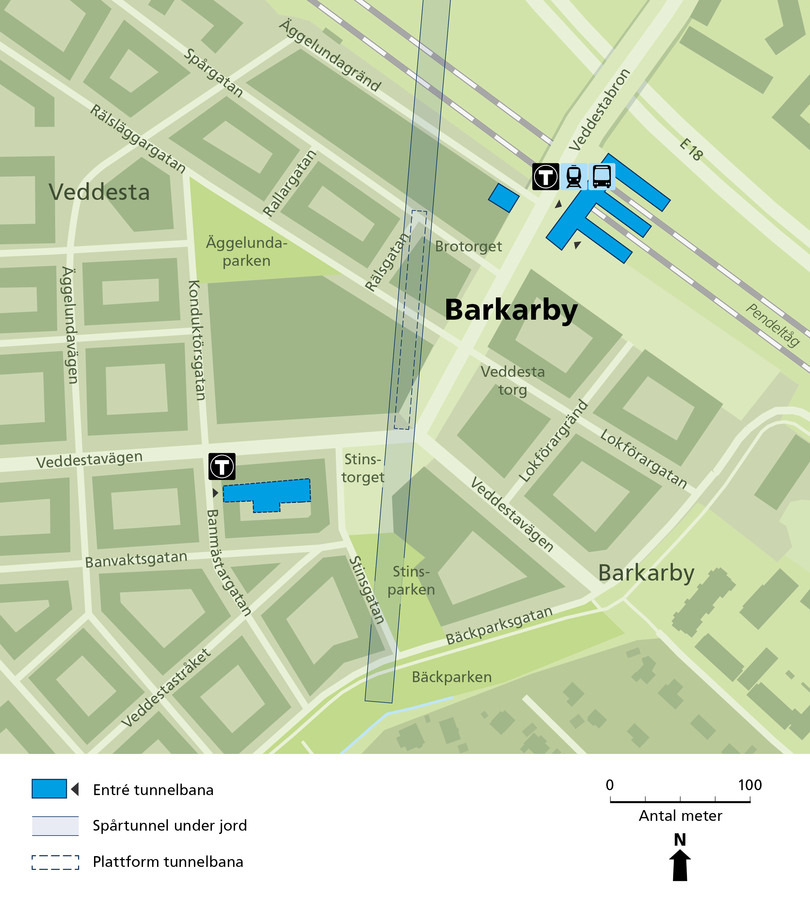 Med tunnelbanan blir Barkarby ett nav för kollektivtrafikresenärer. Barkarby pendeltågsstation får en till stationsbyggnad vid Veddestabron. I den nya stationsbyggnaden finns en entré till tunnelbanan. På så sätt kommer tunnelbanans biljetthall att ansluta till pendel-, regional- och fjärrtågen och bussterminalen.