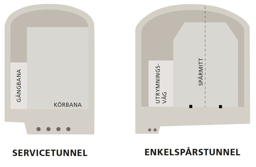 The service tunnels are smaller than the rail tunnels and are asphalted so that service vehicles can use them. This is a type of tunnel not found in the existing metro system but that is needed now due to new legal requirements.