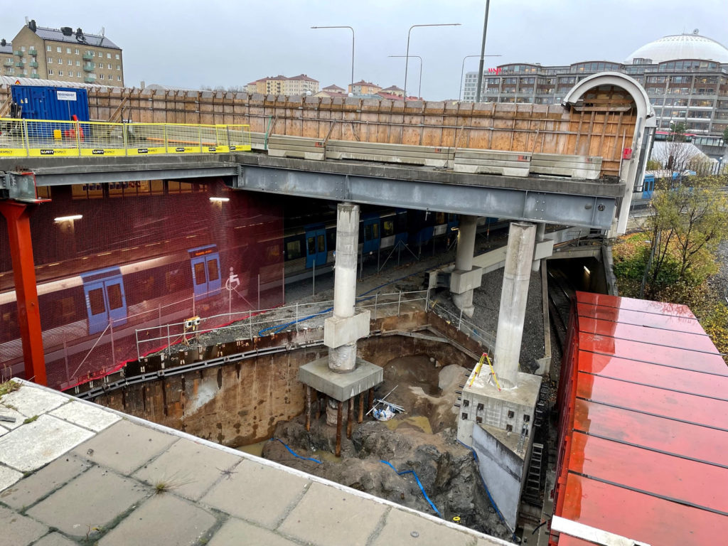 Precis intill det befintliga spårområdet vid Gullmarsplan bygger man nu det stora hisschaktet som ska gå 70 meter ner till plattformsrummet.