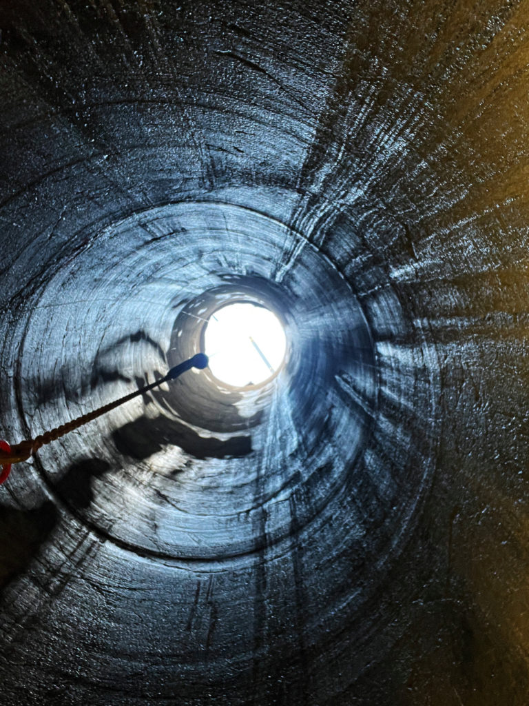50 meter under står Angelica Rosenlund och lyser med ficklampa mot det 4,5 meter breda hålet som borrats med så kallad raiseborrning, vilket gör att det är helt runt.