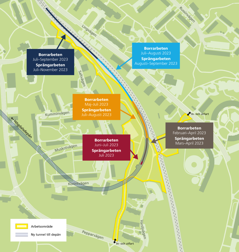 Sprängarbetet ovan jord kommer att återupptas under mitten av juni och pågår sen till och med november 2023. Kartan nedan visar en preliminär tidplan över arbetet.