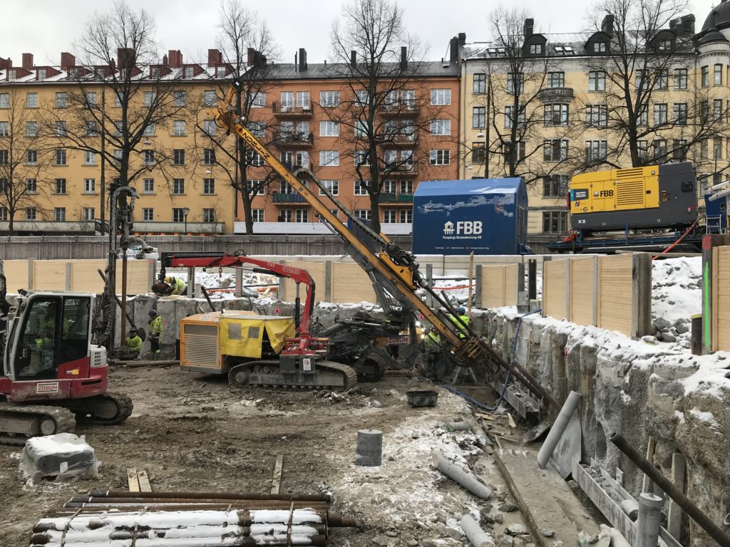 I Stigbergsparken råder febril aktivitet. Nu när stödkonstruktionen är installerad ska vi ta oss ner på djupet. Det görs genom ovanjordssprängningar. Dessutom pågår så kallad stagborrning, vilket är ett viktigt moment för att förankra stödkonstruktionen runtom det kommande hisschaktet.