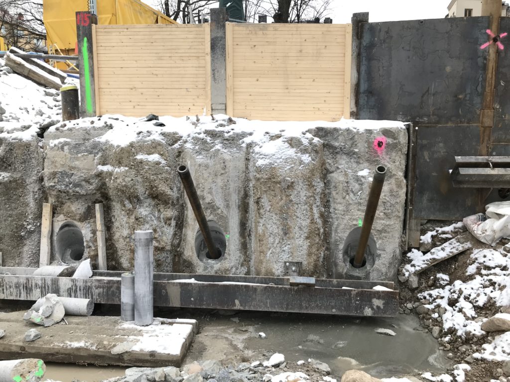 Inför kommande schaktning behöver stödkonstruktionen förankras med hjälp av stag. Stagen som används är självborrande. För att kunna borra ned stagen i de bestämda sekantpålarna görs först håltagning.