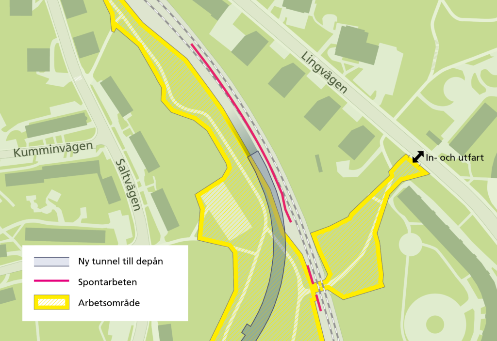 I Hökarängen pågår arbetet med en ny tunnel mellan Högdalsdepån och tunnelbanans Farstagren. I sommar kommer spontarbeten att göras i spårområdet i höjd med Lingvägen 176–196. Spontning är ett bullrande arbete som låter mycket. Arbetet startar efter midsommar och beräknas pågå i ungefär åtta veckor. Tunnelbanan mellan Hökarängen och Farsta Strand kommer att vara avstängd under hela perioden. Trafiken ersätts med bussar.